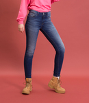 Fashion fading and whiskering. Skinny fit. Subtle distressing at pockets. Belt loops. Zip fly with button over. Metal rivet detail at pocket corners.